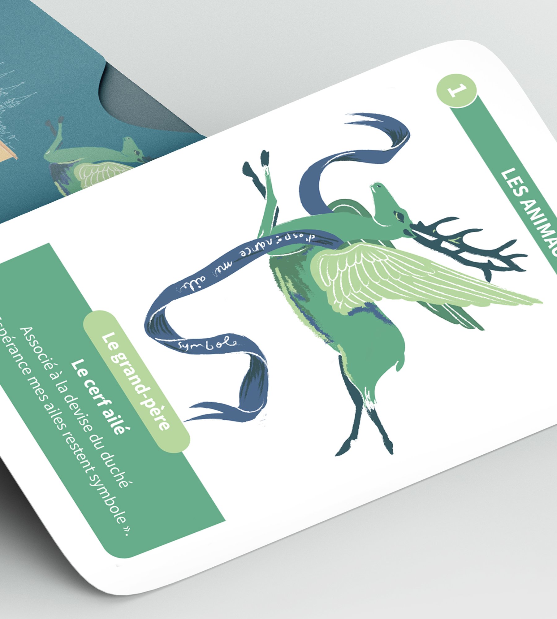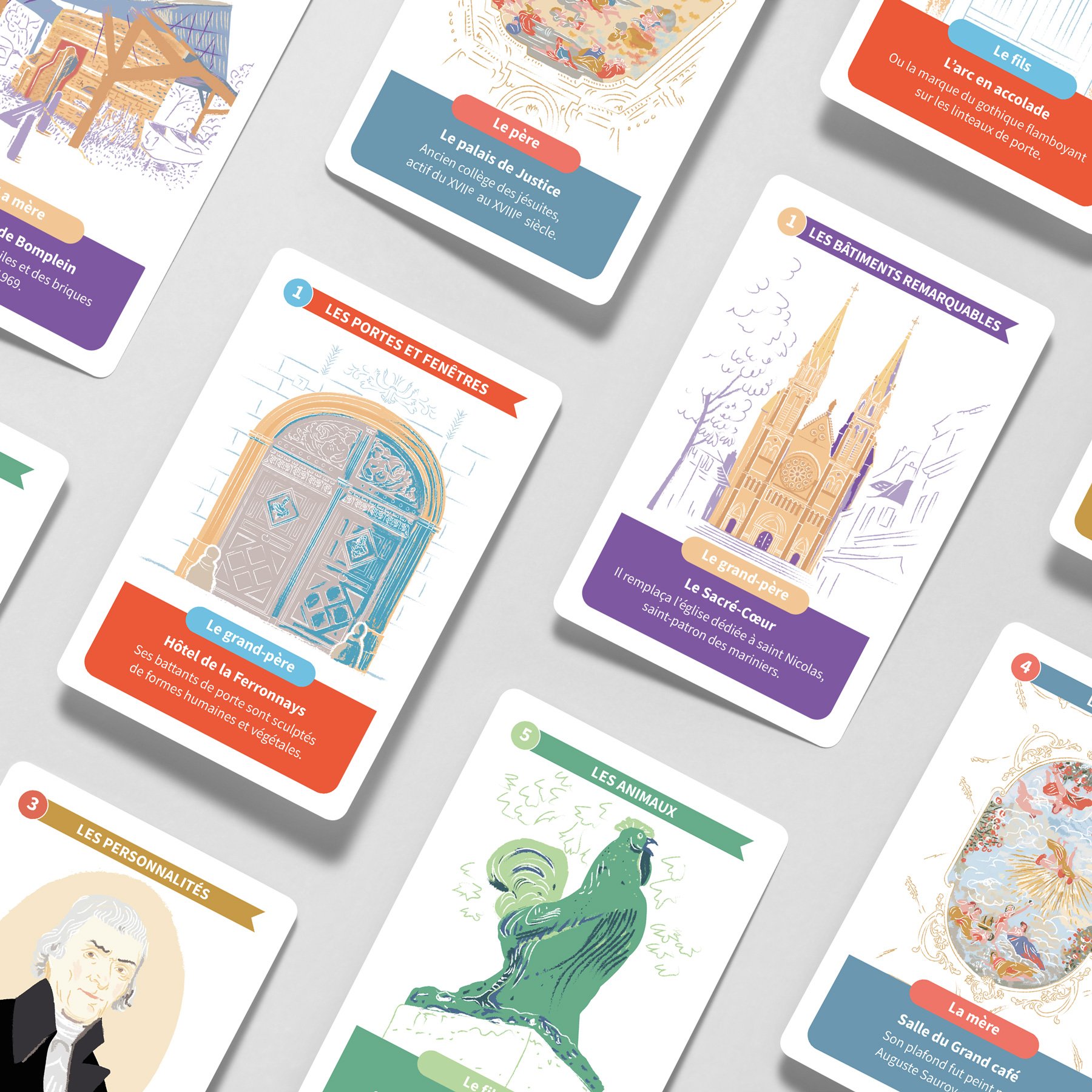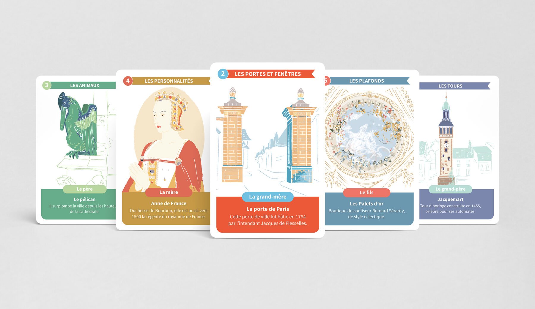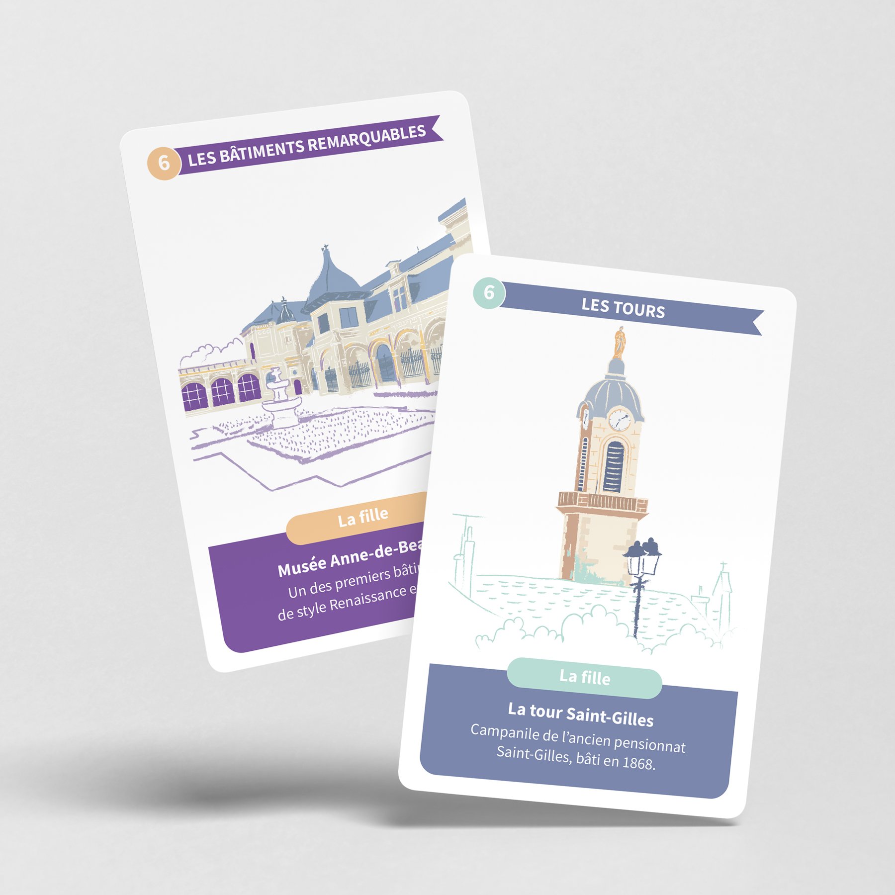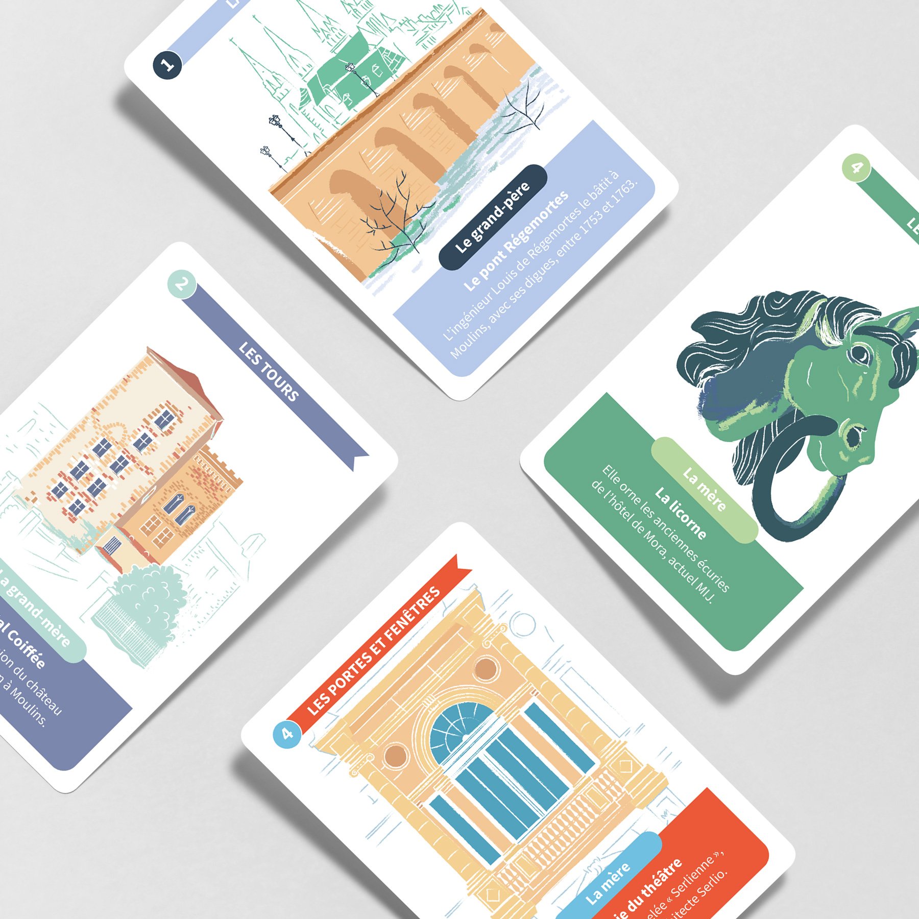 Création d’un jeu de cartes sur le patrimoine de Moulins et ses alentours : réalisation de 44 illustrations, de la mise en page et de l’étui du jeu.