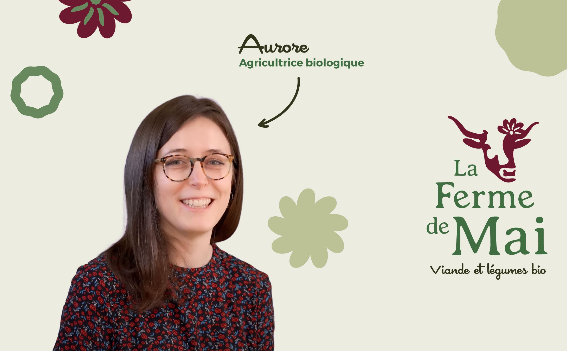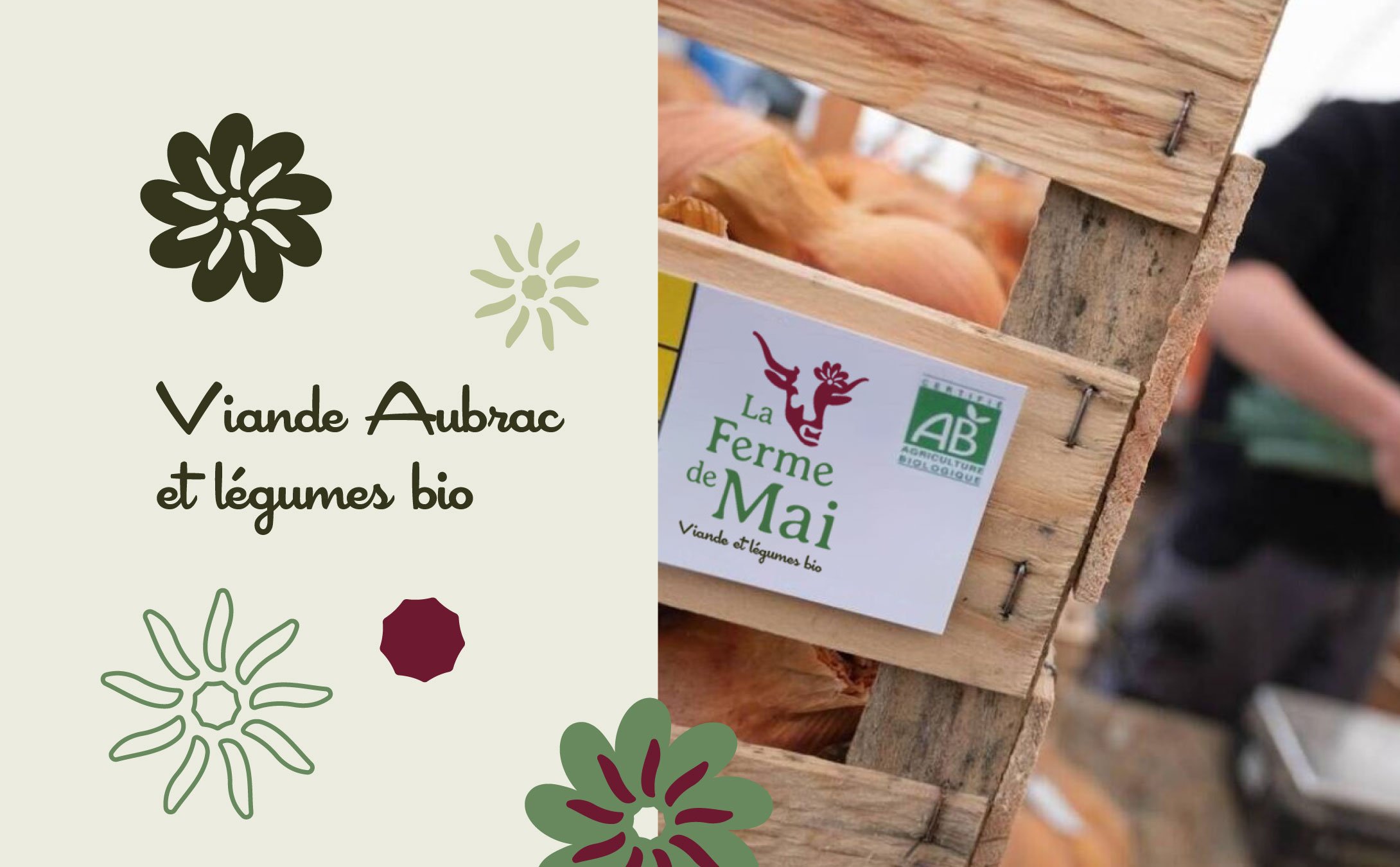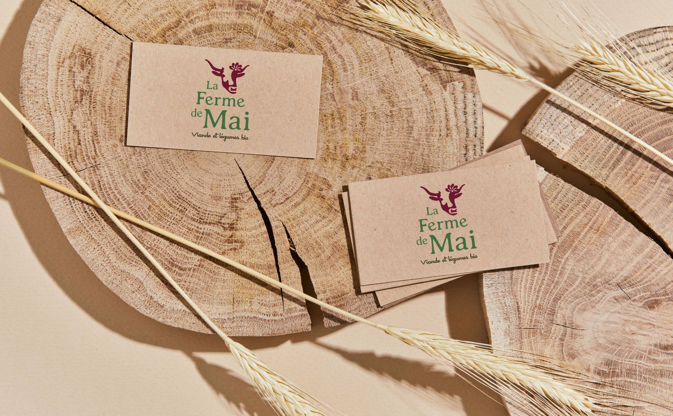 Aurore reprend la ferme de son père, installé en bio depuis 1989 et a souhaité pour cela concevoir une identité avec comme point de départ ce nom, « La Ferme de Mai ».