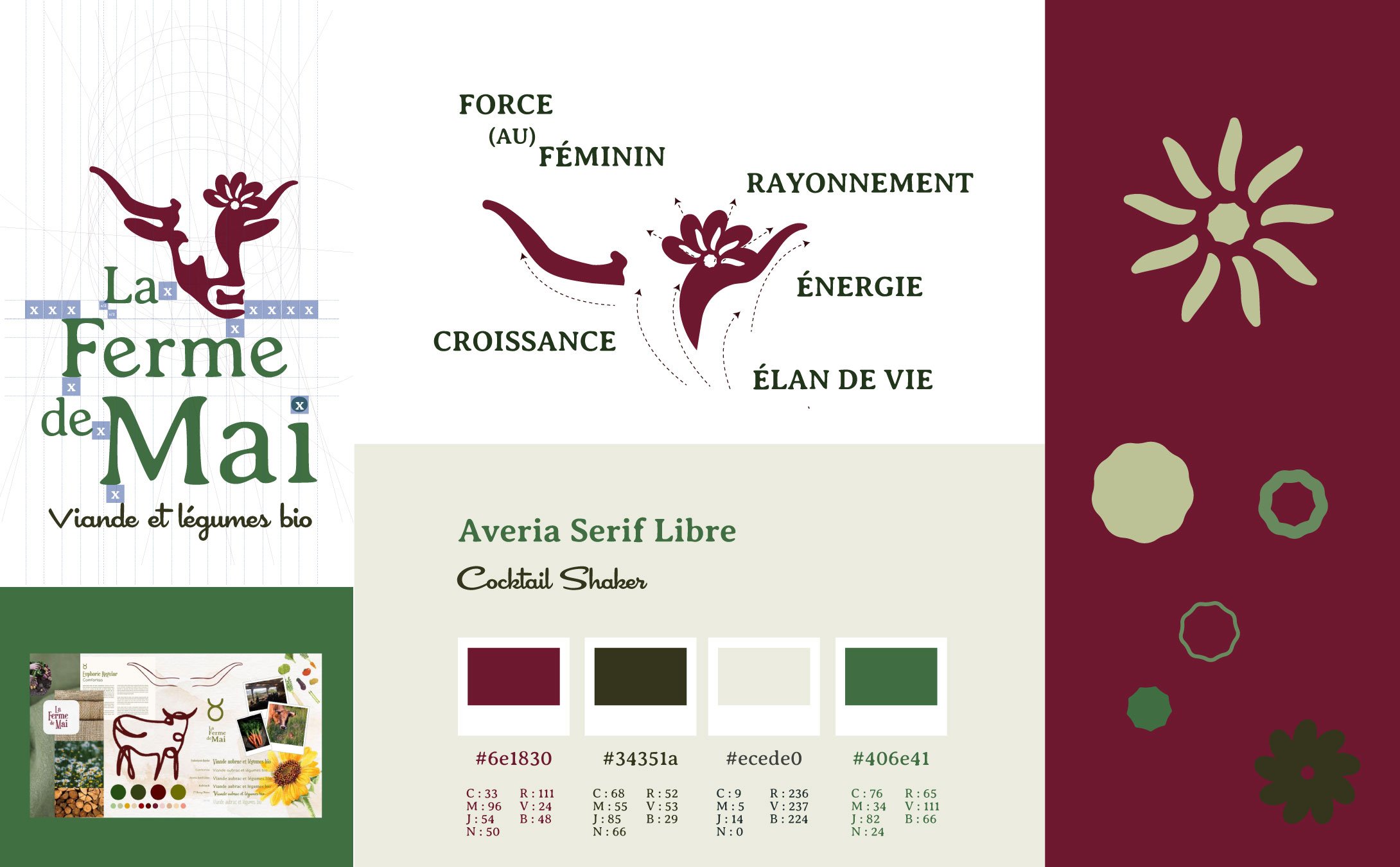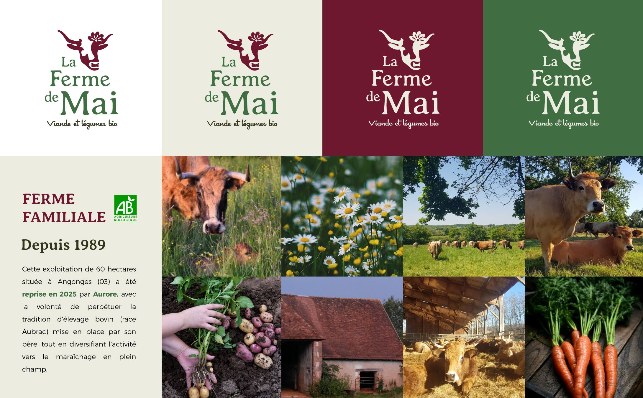 Voici l’identité visuelle que j’ai créée pour la Ferme de Mai, une ferme en agriculture biologique située à Agonges dans l’Allier.