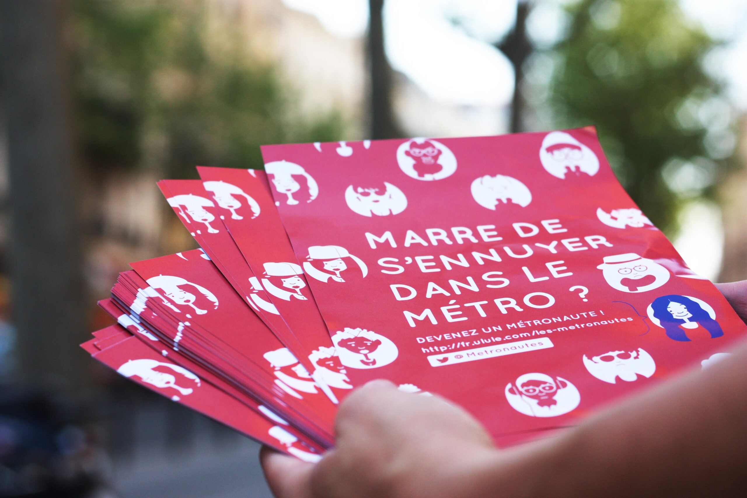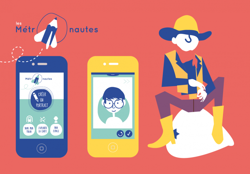 Les Métronautes est une application pour smartphone disponible sur le store depuis 2015. Elle propose à son utilisateur de réaliser le portrait de son voisin de métro à l’aide d’illustrations déjantées, de lui inventer une vie extraordinaire et de partager son histoire sur la carte du réseau de transport.