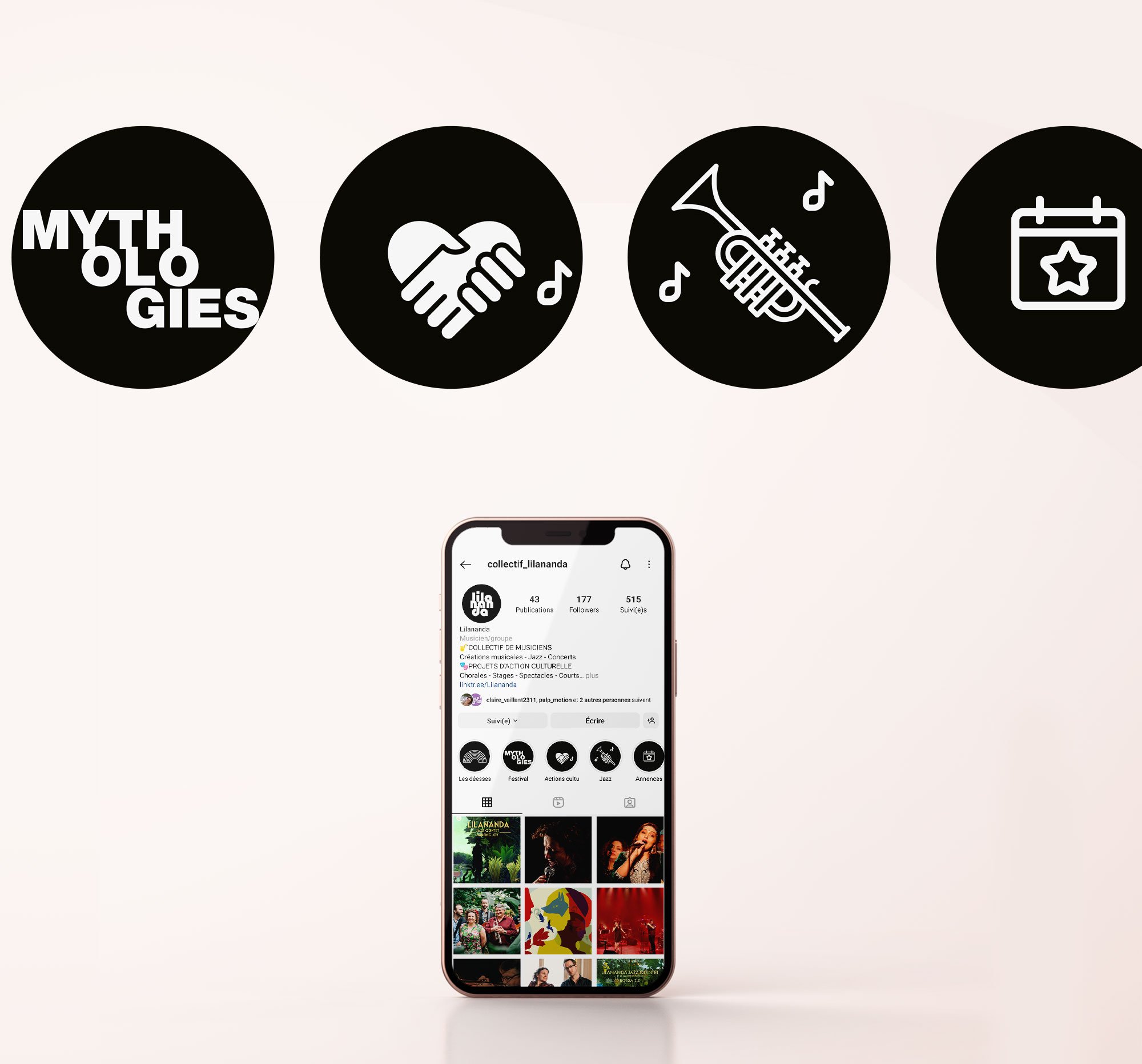 J’ai réalisé plusieurs pictogrammes pour les highlights du compte Instagram. Il s’agit des onglets, ces petites vignettes rondes sur lesquelles sont sauvegardées les stories archivées. Pour le contenu du feed, j’ai pioché dans les vidéos et dans le corpus photographique existants de l’association et réalisé quelques visuels, souvent d’après des éléments illustratifs existants (affiche du festival, pochettes d’album…)