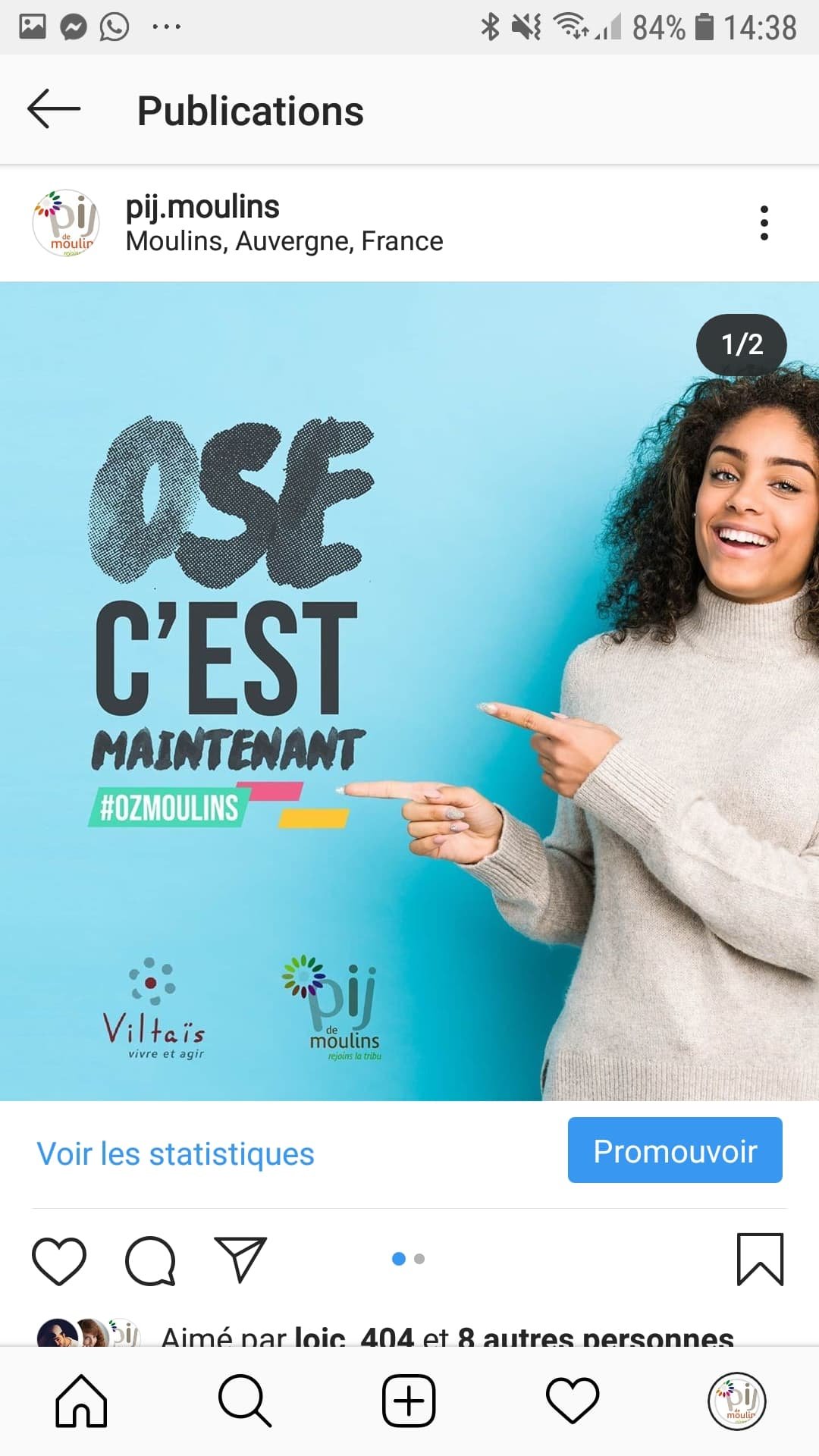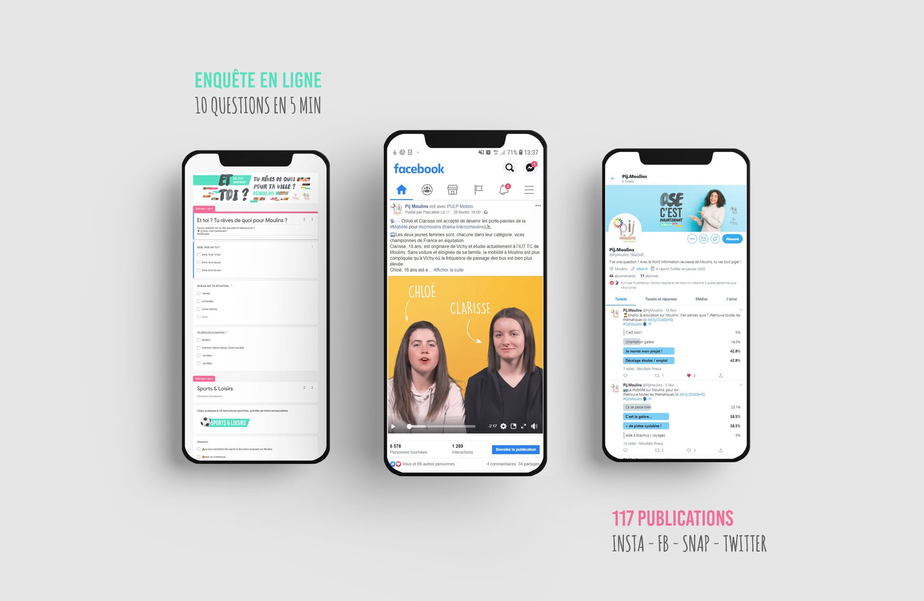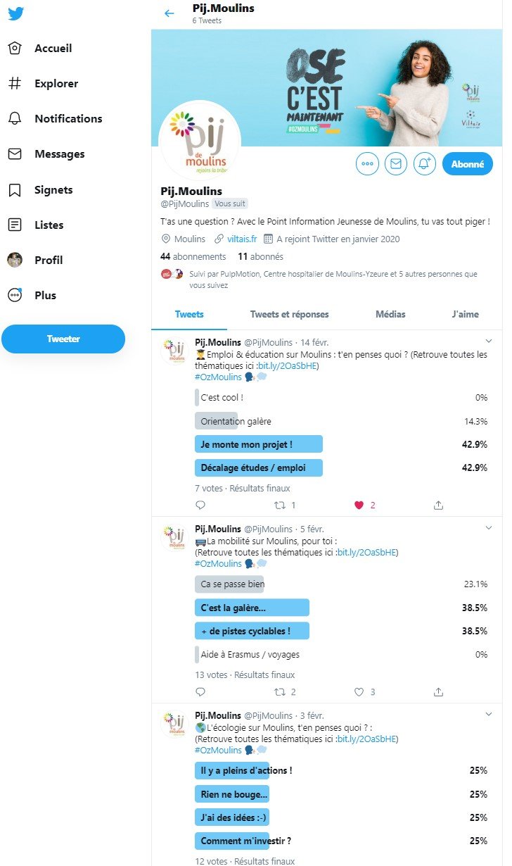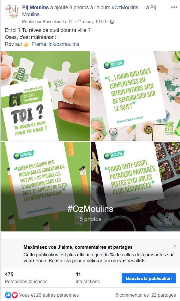 - Community management : 117 publications tous réseaux sociaux confondus, Facebook, Instagram, Twitter, Snapchat (comptes du Point Information jeunesse de Moulins et de Bouge Toi Moulins) et 1 campagne sponsorisée Facebook / Instagram. Compte Instagram créé pour le PIJ.